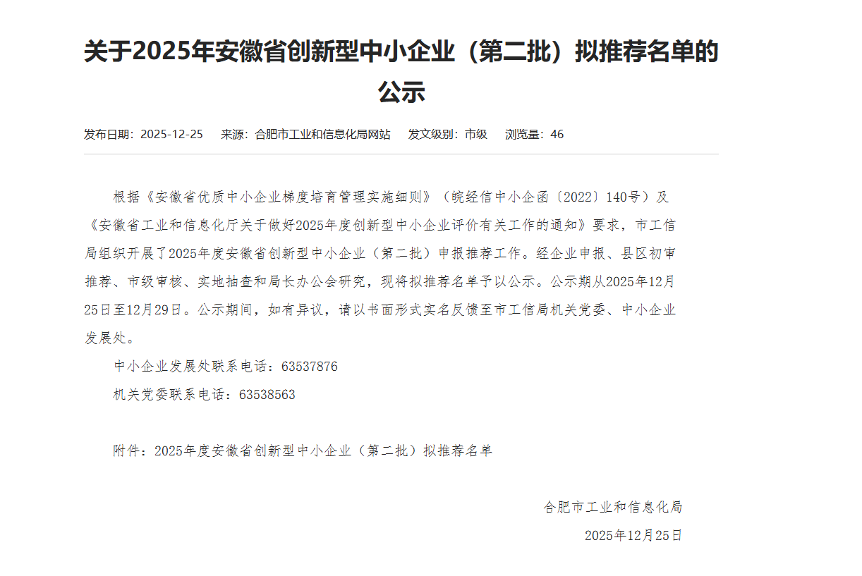 喜訊 | 祝賀我司榮獲2025年度安徽省“創(chuàng)新型中小企業(yè)”稱(chēng)號(hào)